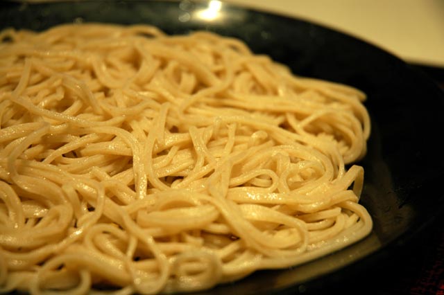 This picture alone should be sufficient to give you an idea of the quality of the soba they produce. You can see the rough 'homemade' texture, the result of a long preparation which includes making the flour itself! Most importantly, the noodles are cooked to perfection. Most other restaurants tend to overcook them, killing the soul of this delicate noodle. Soba must be removed from the heat at the right time, and immediately chilled in order to preserve its consistency.
